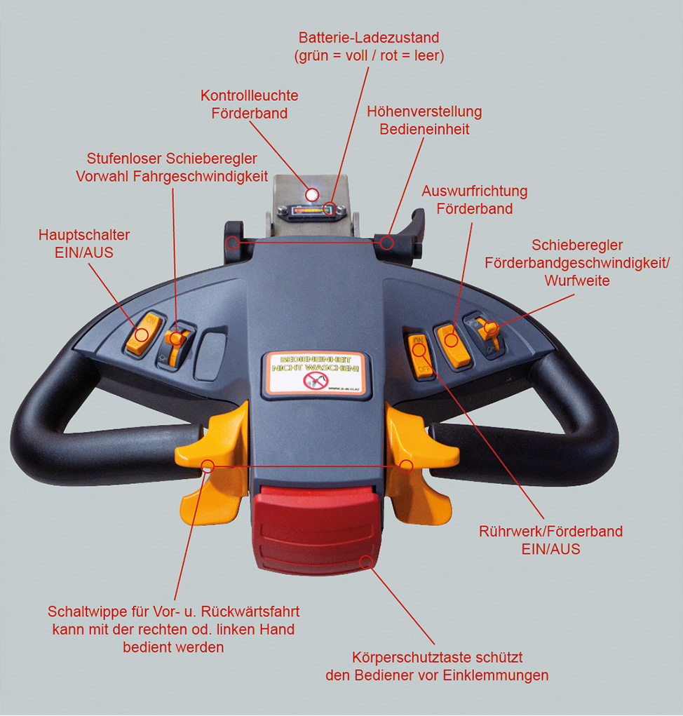 Der EinstreuMax ist mit einem leistungsstarken Akku ausgestattet, der sowohl für den Fahrantrieb als auch für das Rühr- und Verteilerwerk zum Einsatz kommt.